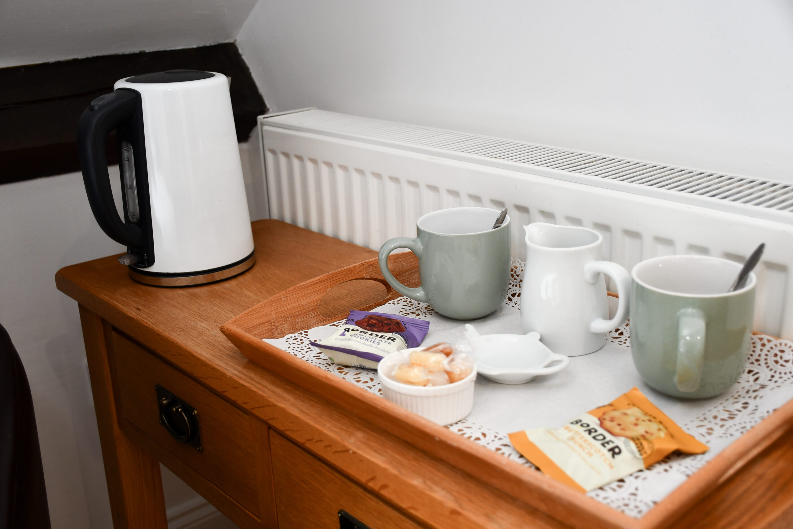 - Kettle, tea, coffee & fresh milk